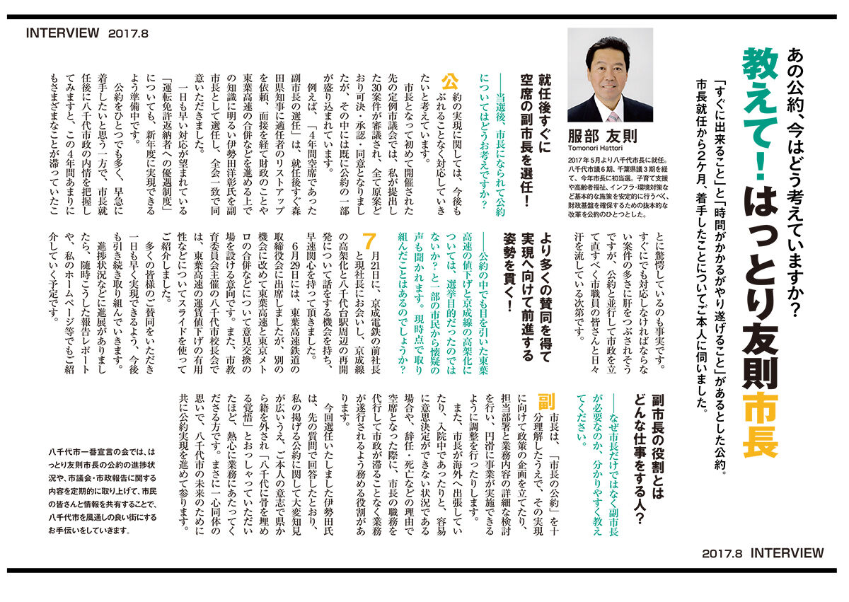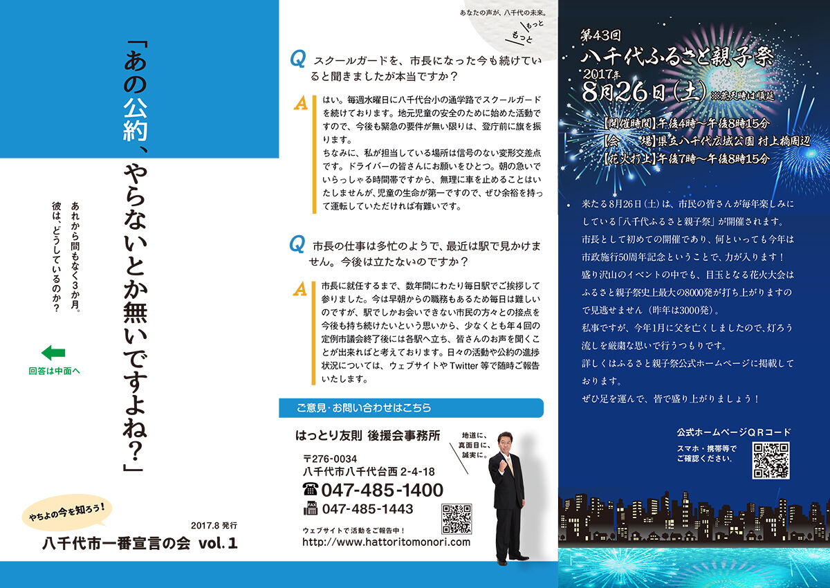 『はっとり友則市長の公約の進捗状況や、市議会・市政報告に関する内容を定期的に取り上げて、 市民の皆さんと情報を共有することで、八千代市を風通しの良い街にするお手伝いをしていきます。』というスタンスのもと、“八千代市一番宣言の会”から発行されたリーフ第1弾。